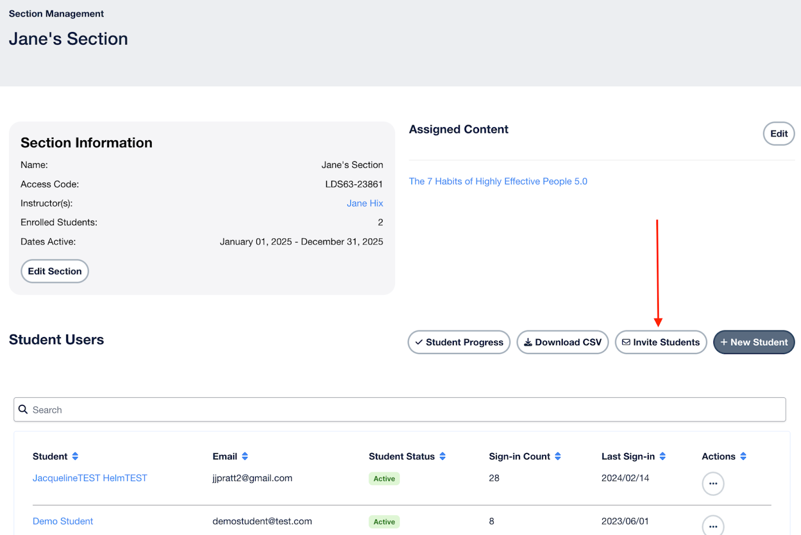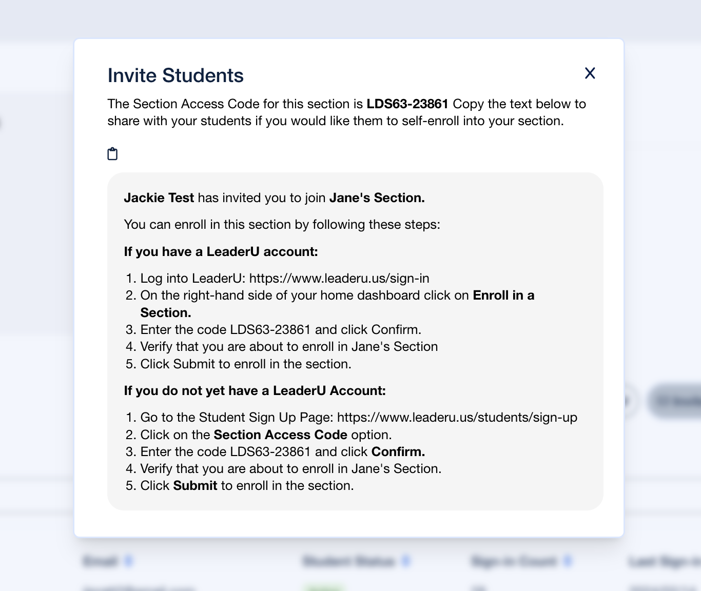 - Within a manually created section (non-Canvas LTI section), an Invite Students button now exists in order to easily provide students with instructions on how to sign up for LeaderU and enroll in a section.