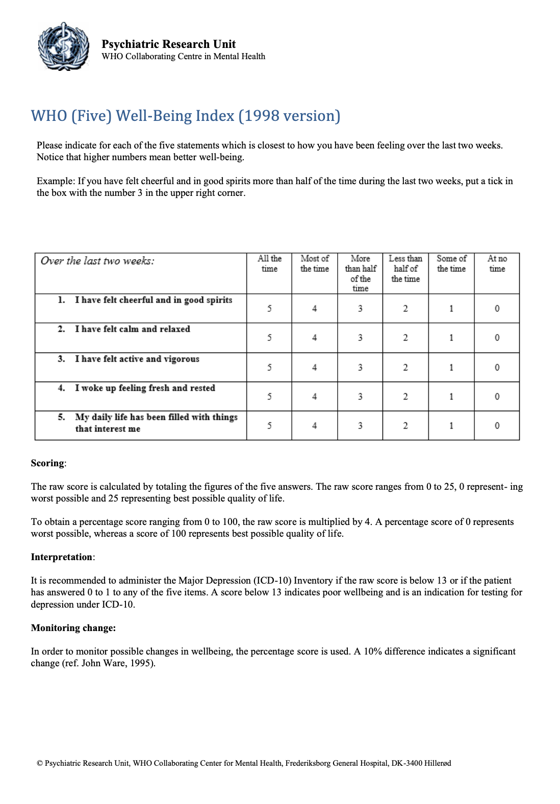 The WHO Well-Being Index survey is what we recommend to provide to students prior to their LeaderU course. It is a quick 5 question survey they can take before the course and then again once they complete the course.