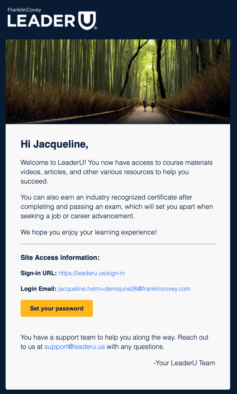 If a student user is added directly from the Students page in LeaderU or via our Bulk Upload tool, students will receive this version of the email to set their account password on their internet browser.