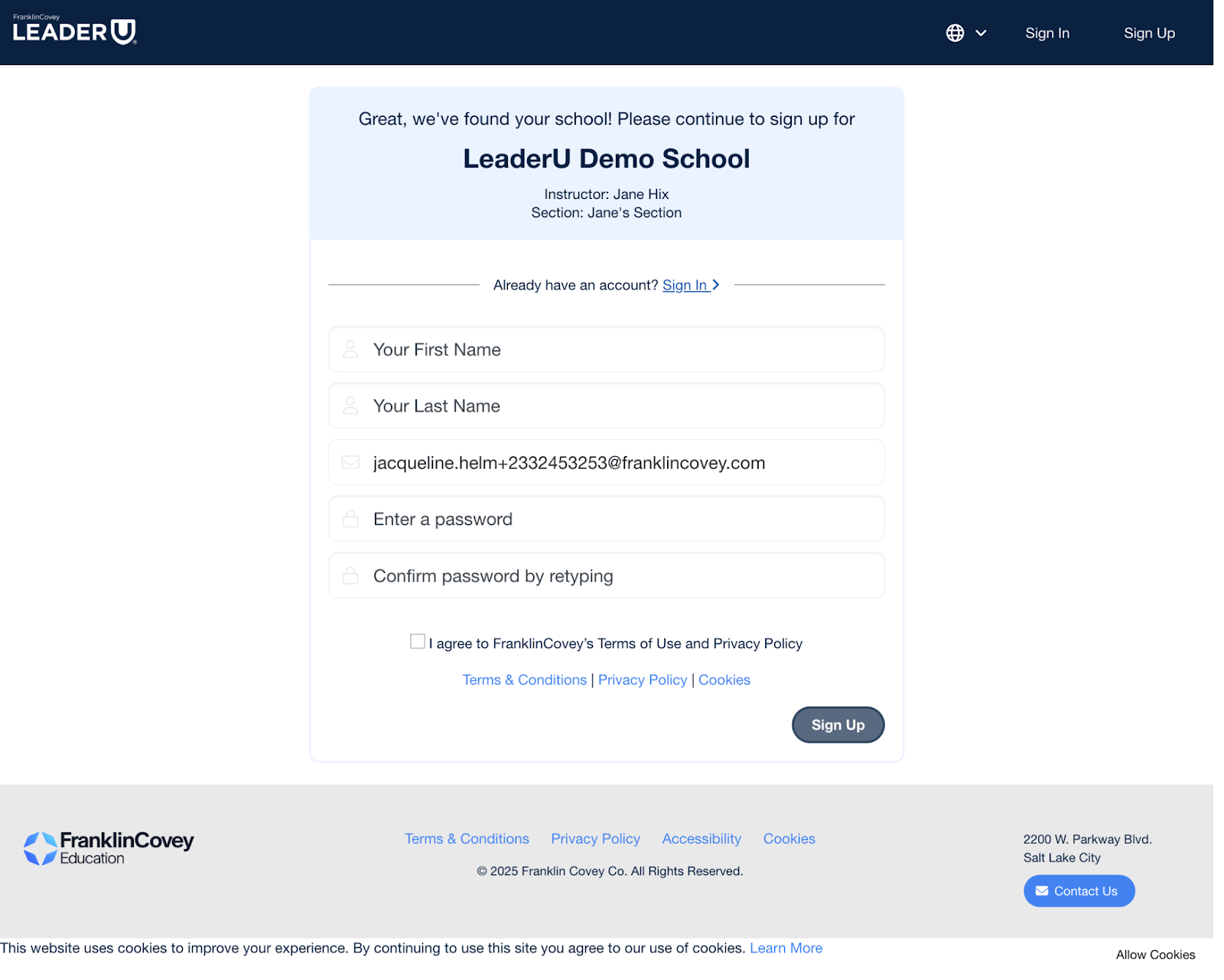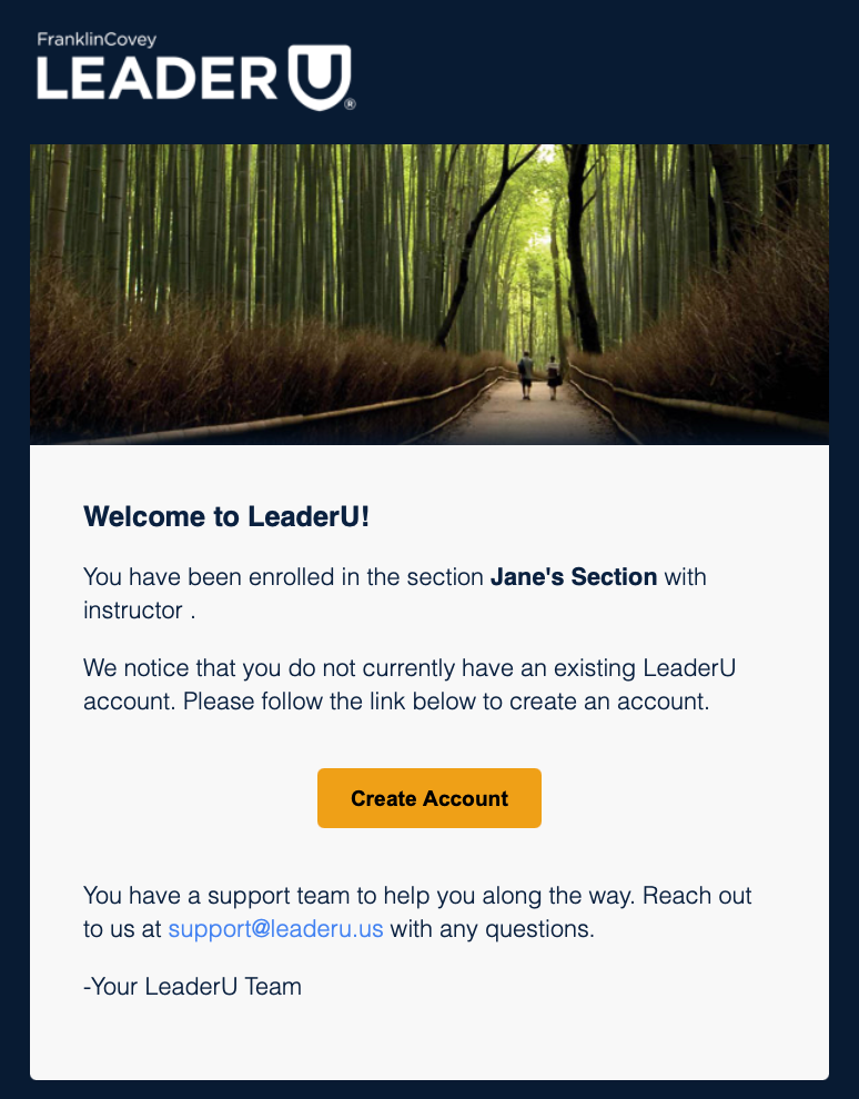 LeaderU Students begin their learning journeys with either a welcome email, which is sent from noreply@leaderu.us, or by signing up with a Bookstore or Section Access code.