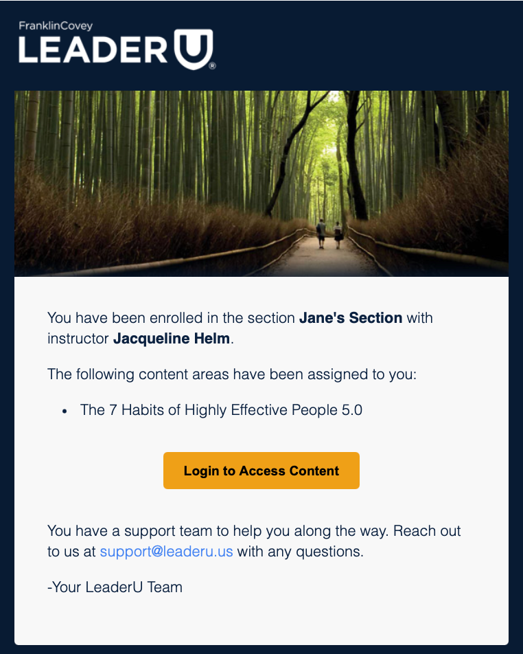 If a student user is added directly to LeaderU Section by their Instructor, the student will receive this section enrollment notification email: