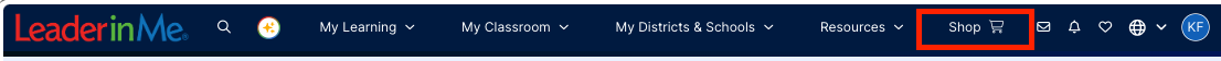 You can access the Leader in Me store anytime in your top navigation. It is linked under the word "Shop" with the cart Icon